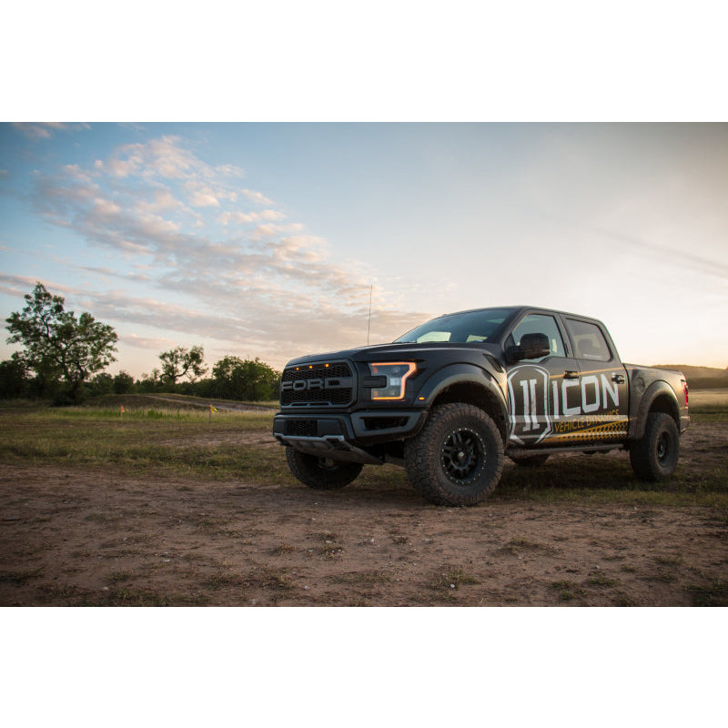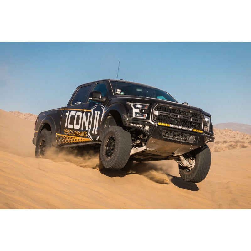 The rear of the updated Ford Raptor was a highlight for ICON engineers, as new changes proved to be for the better. One significant change was that the shock mounting layout went from a parallel style setup to an offset design. While this is great for controlling axle wrap, it required a thorough reevaluation of the way ICON shocks would need to function to make the most of the refreshed rear end. In the R&D process it was found that Gen 2 had more available wheel travel than the original Raptor, and by way of an offset upper eyelet ICON engineers laid out a 3.0 Series bypass shock that maximized travel while utilizing the factory shock mounts. To control the rear end in specific ranges of travel, these shocks feature 3 unique bypass zones – 2 on the compression stroke and one rebound. Unlike other shocks that have a loud bypass “click” when functioning, ICON bypass valves feature damped valve stops for quiet and precise operation. Easy-to-adjust knobs allow for quick changes to shock tuning without the need for tools, enabling the user to dial in their ride with minimal down time. When in use on and off-road, ICON’s patented Anti-Wobble Link stabilizes the shocks to prevent rotation and possible collision. Additionally, urethane shin guards protect the shock shafts and rod ends under grueling off-road conditions.