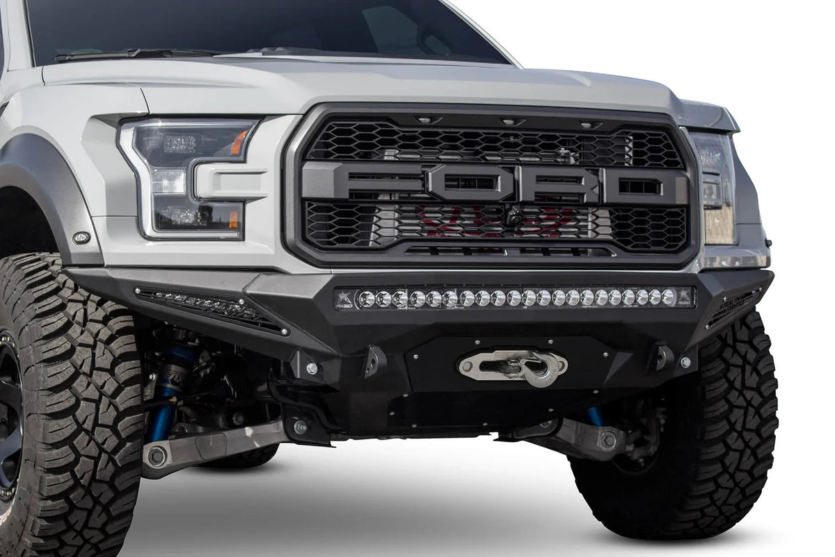 Addictive Desert Designs Stealth Fighter front bumper for the Ford Raptor is one of our tightest fitting and most aggressive looking bumpers on the market. Measuring only 1/2" farther from the grille than the factory bumper the Stealth Fighter gives your Raptor a tight fitting steel plate designed bumper.