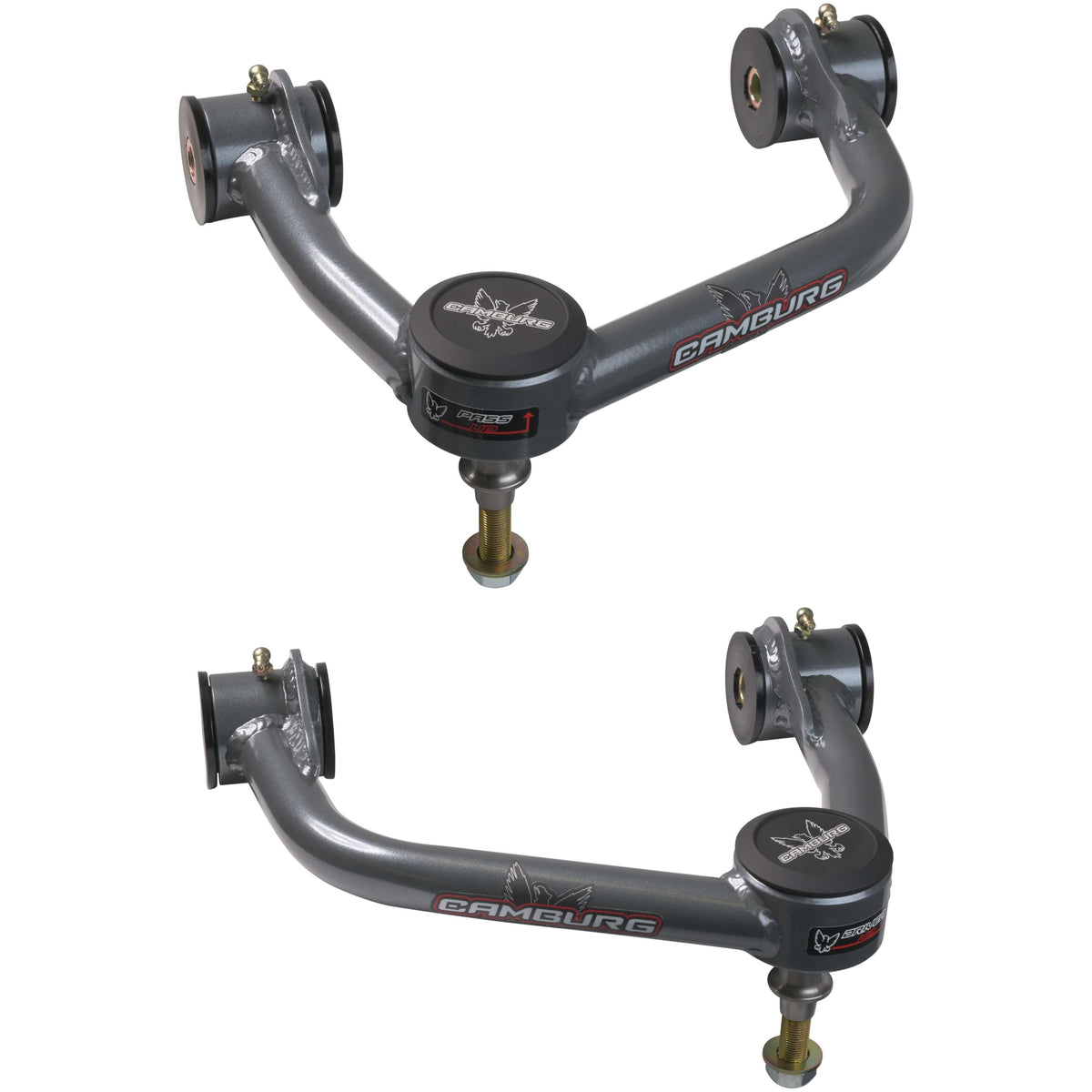 Our Camburg upper arms are designed to address the limitations of stock upper arms when lifting your truck. By replacing the stock ball-joint with a larger 1.25 uni-ball bearing, we improve wheel travel and durability under extreme conditions. We also incorporate a billet aluminum cover to protect the uniball from dirt and contaminants. Our arms are designed using CAD/CAM engineering software and manufactured in-house with precision welding and machining. They come with polyurethane frame pivot bushings, FK 1.25" PTFE-lined uniballs, and all necessary hardware for installation. These arms are compatible with lifts of 1-3" and correct camber and caster.