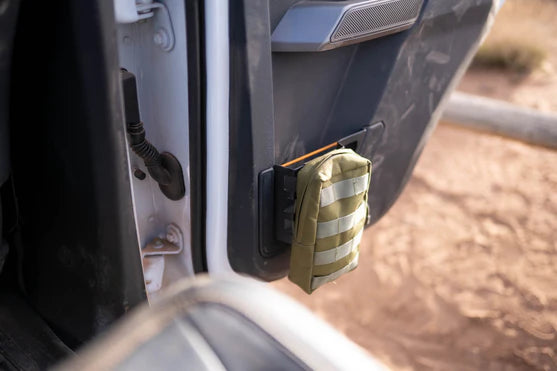 Our 6th Gen Bronco Rear Door Molle Panel Pockets are perfect for those looking for more storage in the rear seating area. They were designed to replace the saggy factory door nets, by holding their form and providing molle mounting opportunities. Small tools, pouches, and kits are great with this application. The panels protrude in just the right way to fit your water bottle or coffee thermos. Finished in a micro-texture black powder coat, the molle panels complement the Bronco’s interior.