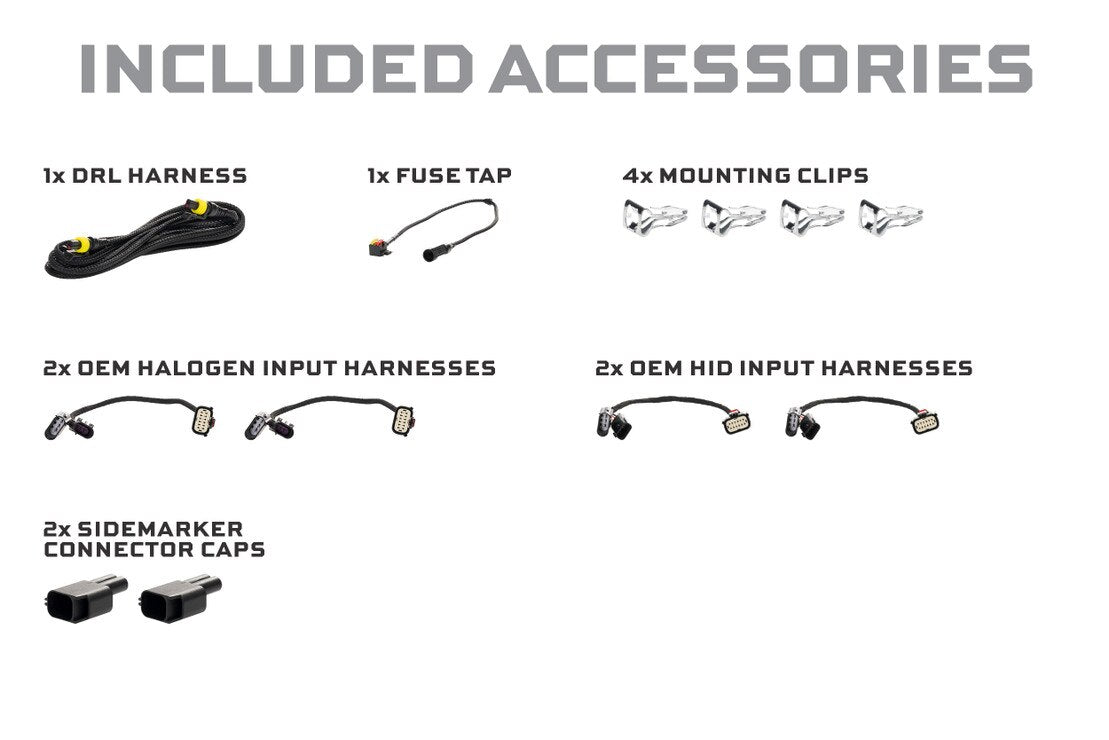 Accessories : 2x Halogen Adapters, 2x OEM HID Adapters, 1x DRL Harness, 4x Mounting Clips, 2x Side Marker Connector Caps, Fuse Tap Hardware