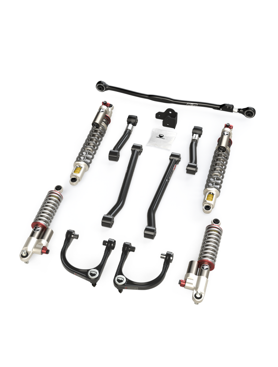 When the 2021+ Bronco platform was released, the TeraFlex engineering team saw major opportunities for off-road suspension improvements—along with a chance to refine the Bronco’s on-road ride quality without sacrificing stability. This complete suspension system includes everything from control arms to brake line relocation brackets, coilover shocks, and all the hardware in between.