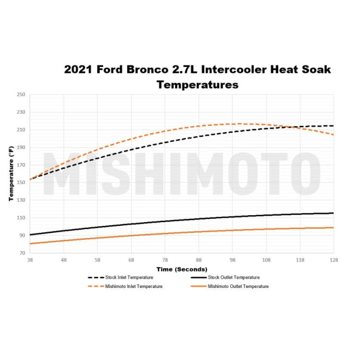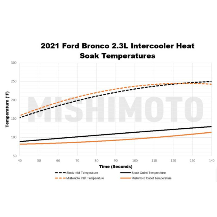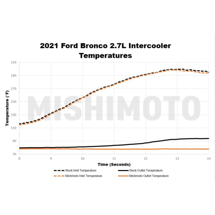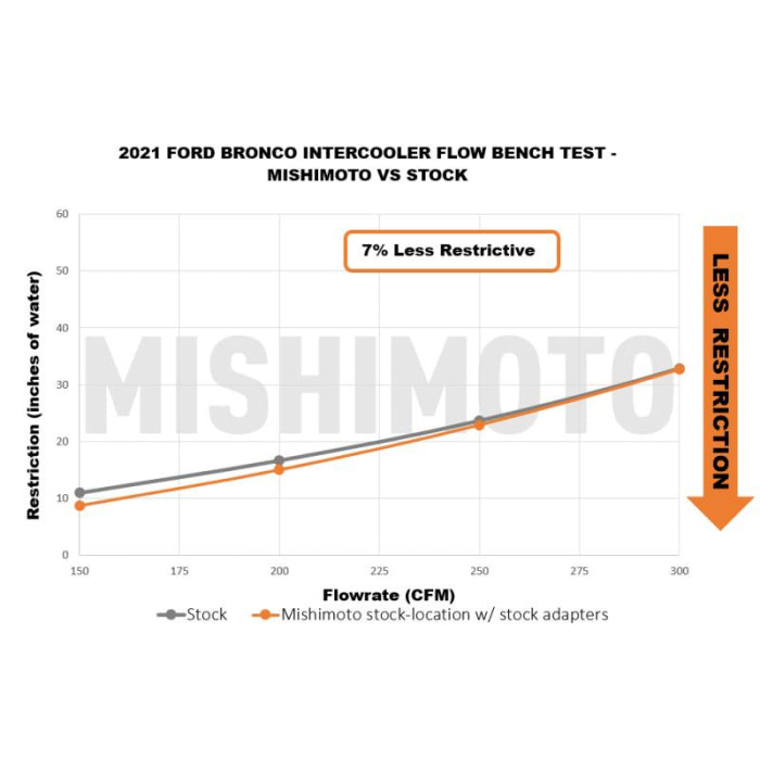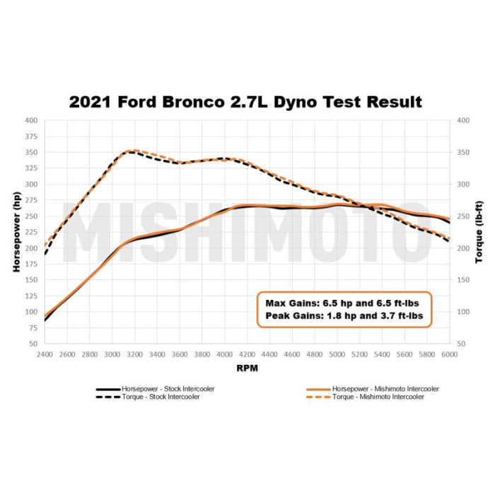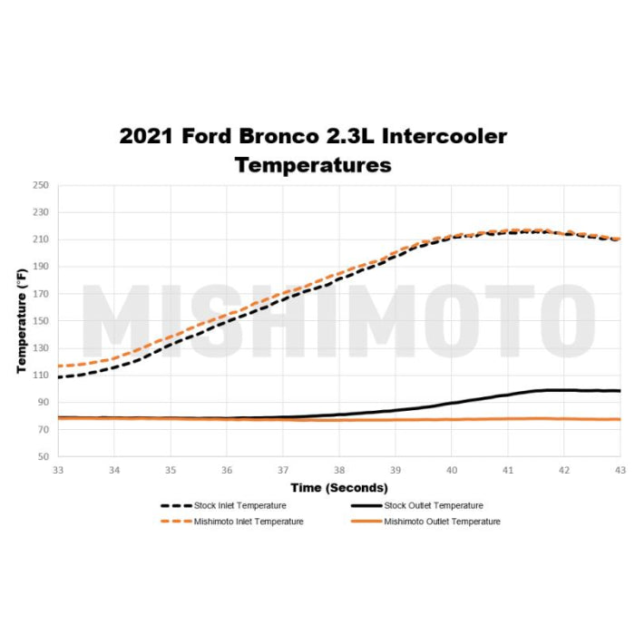 The Mishimoto Performance Intercooler features a 4.7-inch thick core, CNC-machined 6061 aluminium flanges, and precision TIG-welded cast-aluminum end tanks. Combined, this makes for an intercooler that is as robust and ready to take on the world as the Bronco it's designed for. Compared to the factory tube-and-fin intercooler with plastic end tanks, durability against heat, pressure, and debris on the road or trail is significantly improved over stock. More durability is always a good thing, but it's even better when it's backed up with performance.