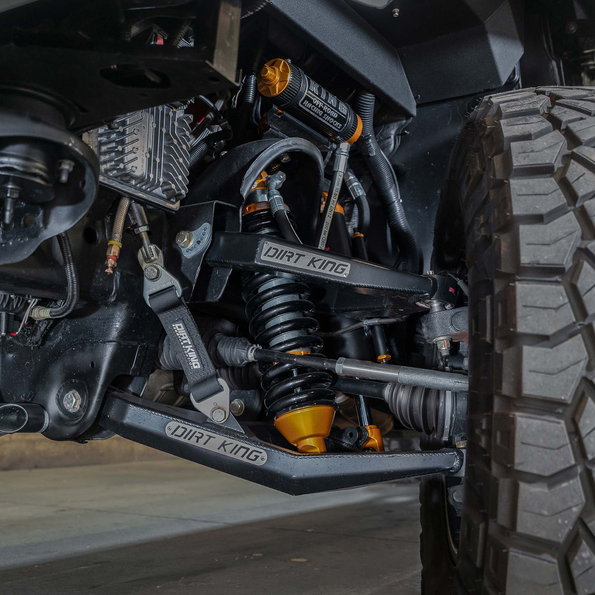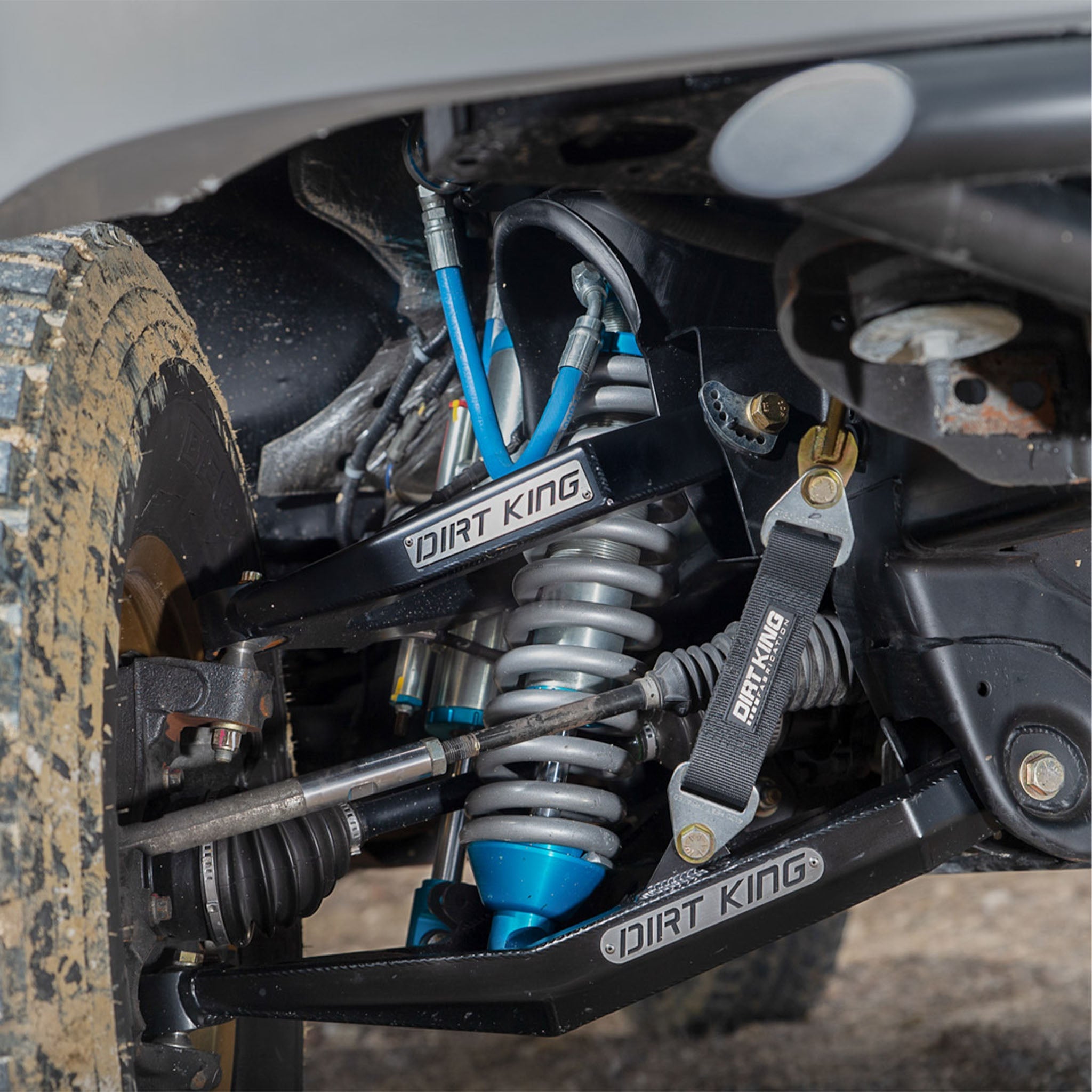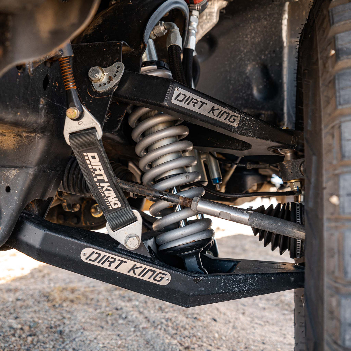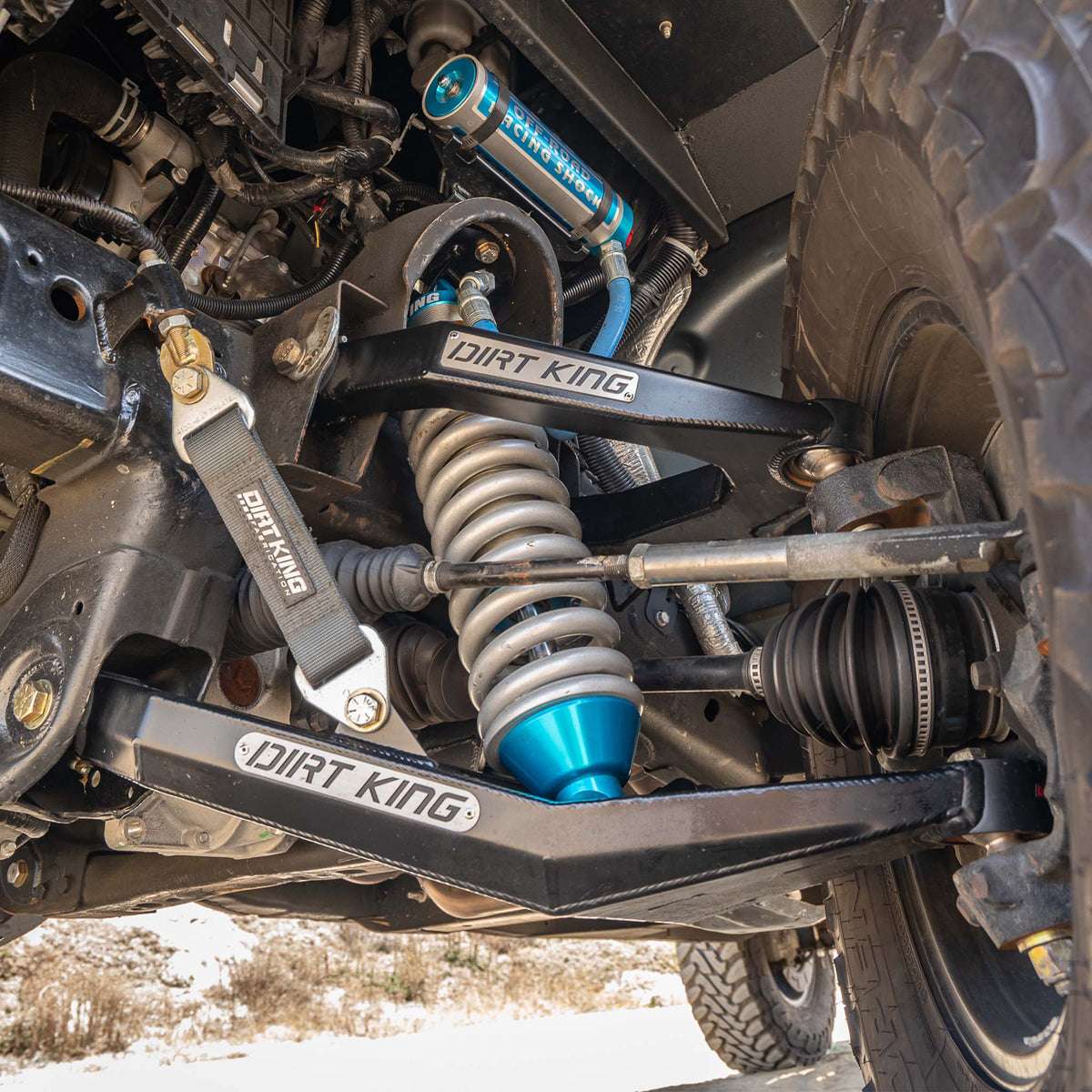 The Dirt King long travel kit was developed to drastically improve the vehicles off-road handling without compromising its day to day driving characteristics. This suspension system allows for 12” of travel and accepts up to a 37” tire. The kit is compatible with 2WD models and 4WD models along with the purchase of extended axle shafts. We upgraded the ball joints to heavy duty Moog joints for maximum strength and increased articulation. The lower arms have recessed shock mounting allowing 8" coil overs to fit without any modifications. This kit is CAD designed, thoroughly tested, and 100% made in America resulting in a product we’re proud to put our name on!