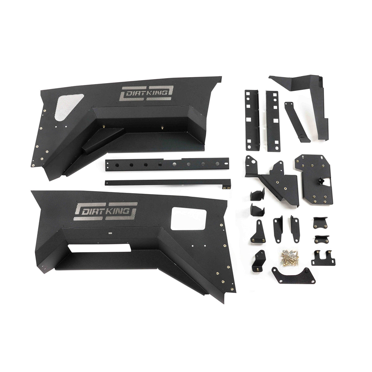 The Dirt King over-sized wheel wells are designed to replace the factory inner fender wells, allowing for proper clearance when 37” tires are installed with long travel suspension. These wheel wells feature a 2.5” larger opening compared to stock and are a complete bolt on application. Everything needed for install is included along with easy step-by-step instructions. In addition, we manufacture an aluminum tank for the windshield wiper fluid that can be purchased separately. The wheel wells are designed for a factory air box, some modifications may need to be made for an aftermarket air box. This product will not work with factory fenders and must be installed with fiberglass fenders.