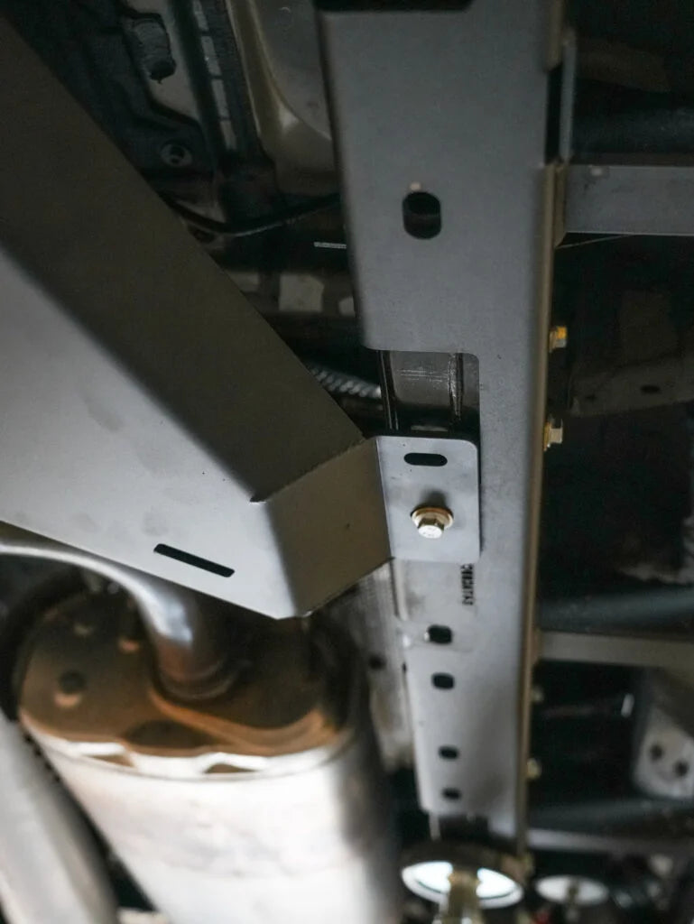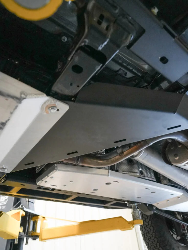 Shields the third cross-member, transfer-case, and exhaust pipe from trail and road impacts.