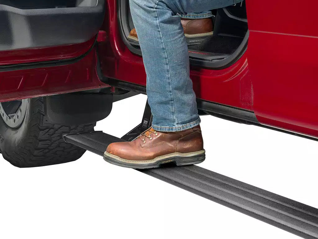 These running boards significantly improve accessibility with their full-length design, oversized 6-inch wide step surface, integrated LED courtesy lights, and over a foot of drop from the door sill plate on most applications! Whether you’re piloting a bone-stock pickup or a lifted rig running oversized tires, AMP Research PowerStep™ Smart Series running boards significantly ease entry into the cab.